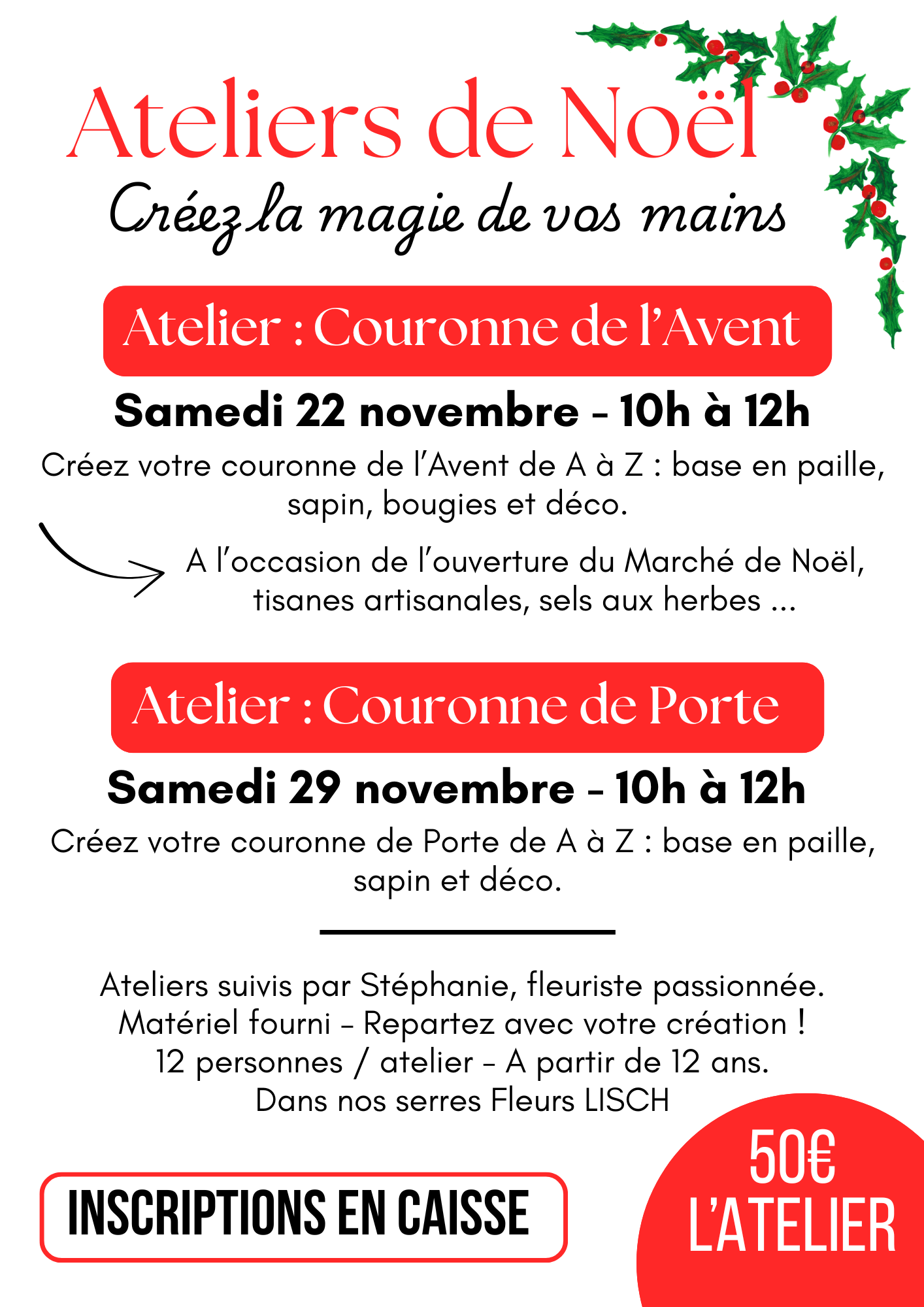 L'atelier Couronne de l'Avent sera le jour de l'ouverture du Marché de Noël, accompagnée par les tisanes et le sel aux herbes Lisch.