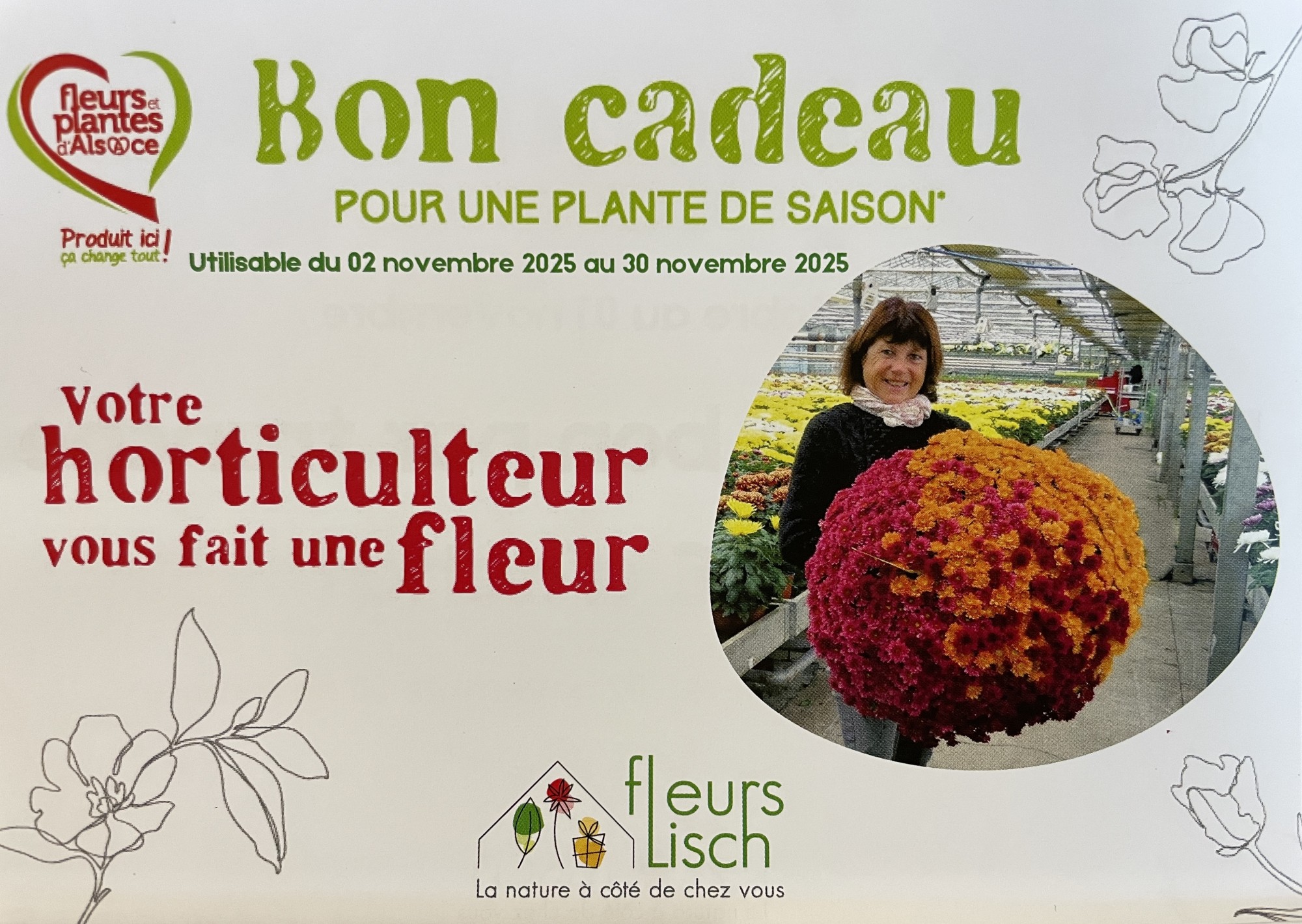 du 15 octobre au 1e novembre, nous vous remettons un bon cadeau pour une plante de saison à choisir dans la sélection prévue à cet effet par tranche de 50€ d’achat lors du passage en caisse. (50€ d’achat = 1 bon ; 100€ d’achat = 2 bons ; 150€ d’achat = 3 bons…). Validité du bon cadeau : il est à échanger lors de votre passage en caisse chez votre horticulteur producteur entre le 2 et 30 novembre 2025, dans la limite d’un cumul de 10 bons cadeaux par personne. Votre horticulteur producteur vous remettra par bon cadeau, une plante de saison à choisir dans la sélection prévue à cet effet. Bon non échangeable ne pouvant donner lieu à une contrepartie financière, totale ou partielle, y compris le rendu de monnaie. Votre magasin ne peut être tenu pour responsable en cas de perte ou de vol de ce bon. Le bon n’est valable que dans le magasin émetteur. Non cumulable avec d’autres promotions ou offres en cours, avec la carte de fidélité, ainsi que sur l’achat de chèques ou cartes cadeaux.